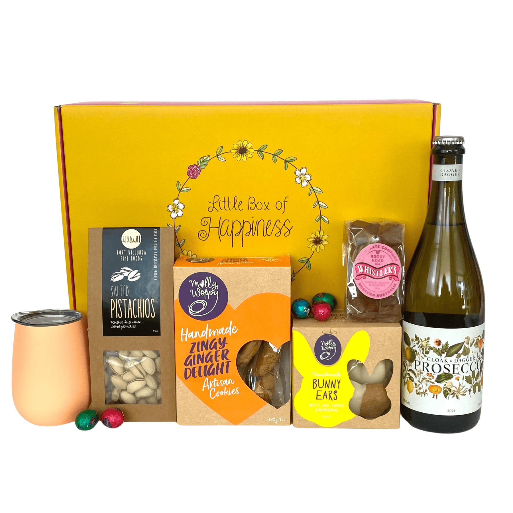 Thoughtfully curated by Little Shop of Happiness, this elegant Easter gift combines gourmet snacks, festive sweets, and a refreshing bottle of Prosecco to create the perfect indulgent surprise.